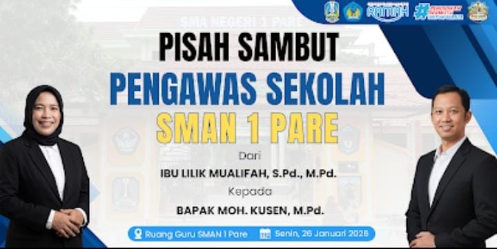 SMA Negeri 1 Pare menyelenggarakan acara pisah sambut pengawas sekolah yang berlangsung dengan penuh kehangatan dan rasa kekeluargaan. Acara ini menandai berakhirnya masa tugas Ibu Lilik Mualifah, S.Pd., sebagai pengawas di SMAN 1 Pare, yang kini estafet kepemimpinannya diteruskan oleh Bapak Moh. Kusen, M.Pd. Seluruh keluarga besar sekolah hadir untuk memberikan apresiasi atas dedikasi yang telah diberikan selama masa jabatan sebelumnya.